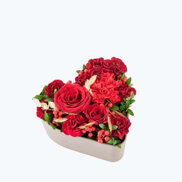 Et vakkert hjerte komponert i intense røde valører. Hjerteskålen er miljøvennlig og produsert av nedbrytbare gjenbruksmaterialer. En spesiell blomstrende hilsen til den du vil glede.